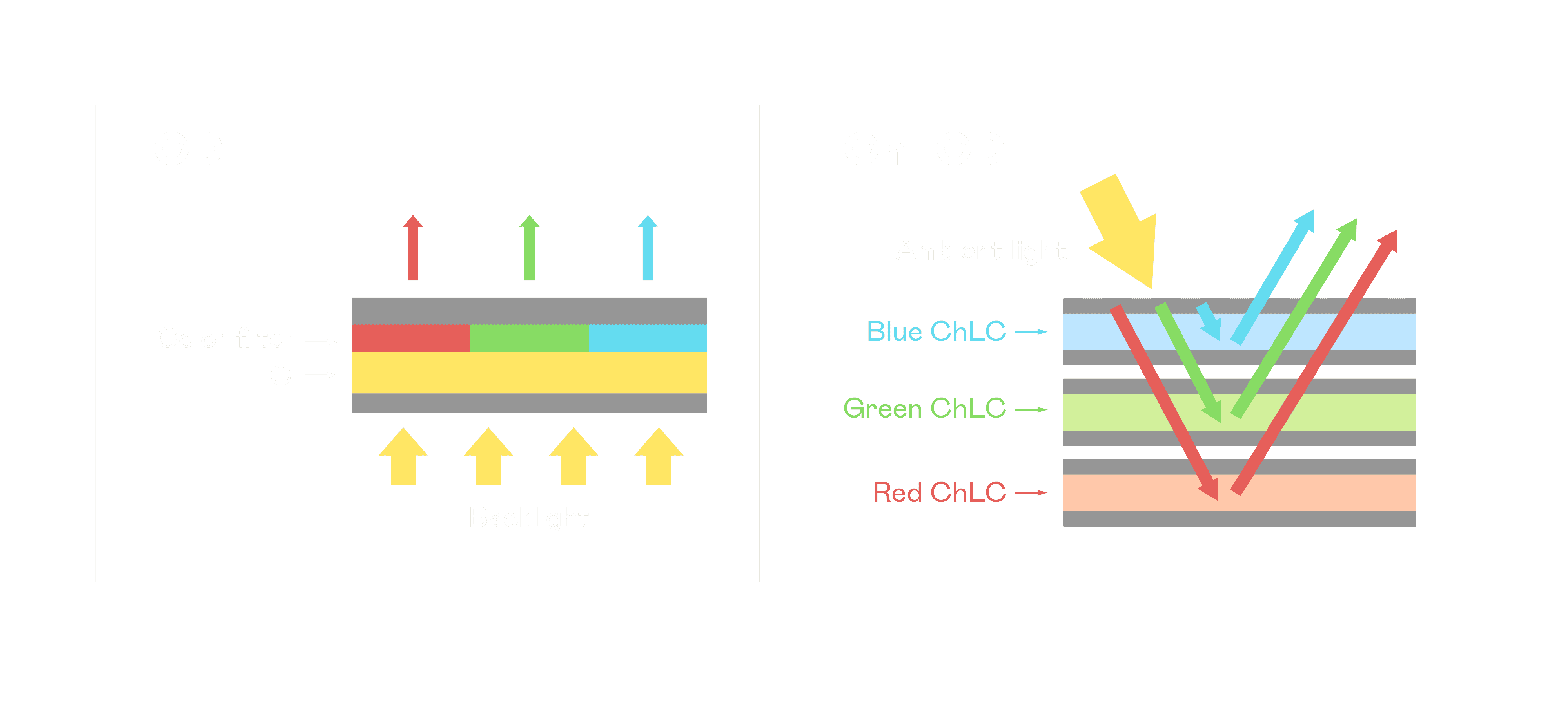 ChLCD 胆固醇液晶就如同纸张一样,,,,透过反射环境光来显示影像,,因此长时间观看不易造成人眼视觉疲劳,,,可达到护眼效果。。。。当处于户外阳光下使用,,LCD 影像容易失真而不易观看,,但胆固醇液晶仍可维持较佳的影像品质。。。。