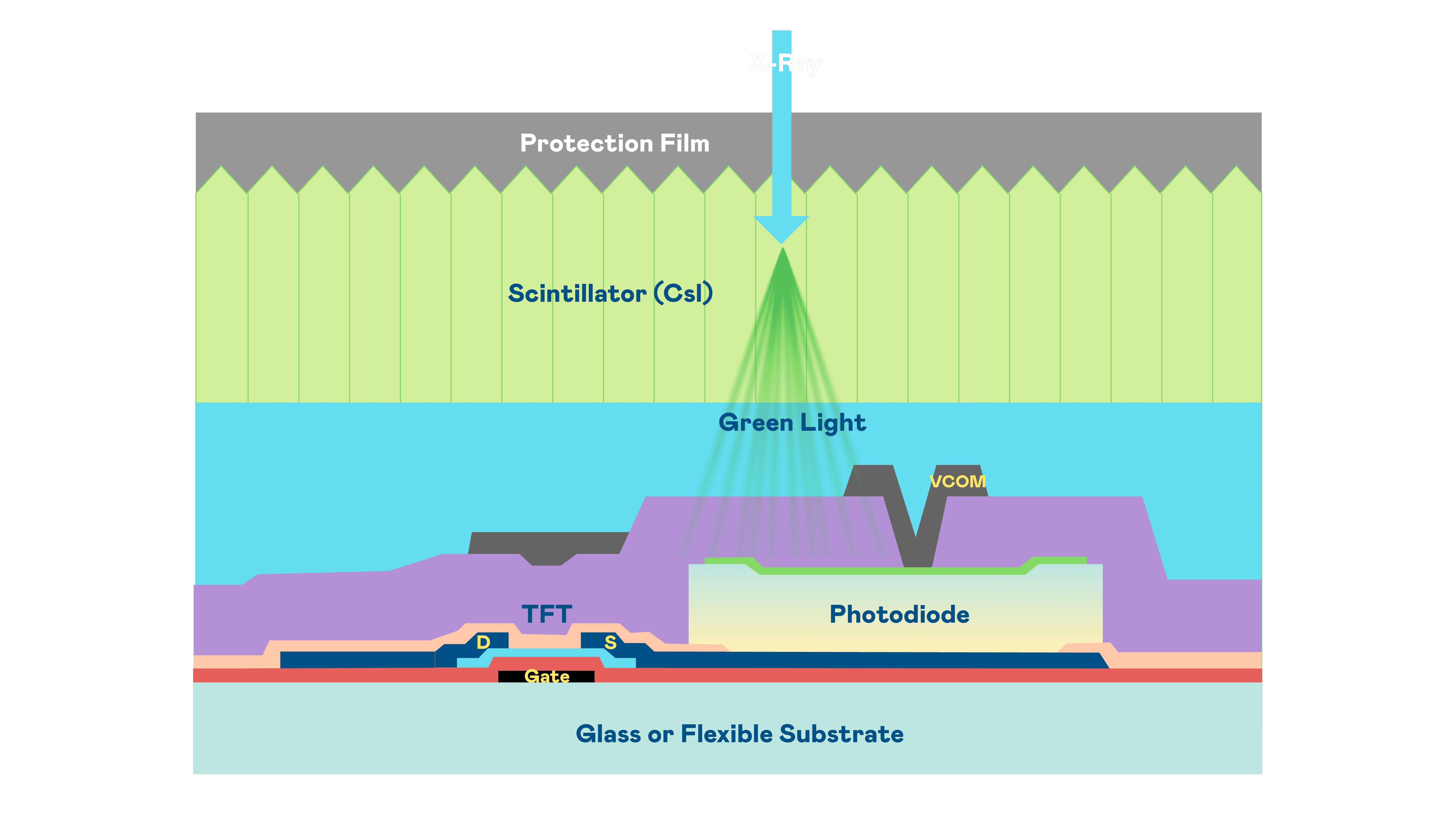万利的X光影像感测阵列使用薄膜电晶体 (TFT) 作为每个像素的读取开关,,搭配光电二极体(Photodiode)的光电转换元件,,用以感测X光影像讯号。。。